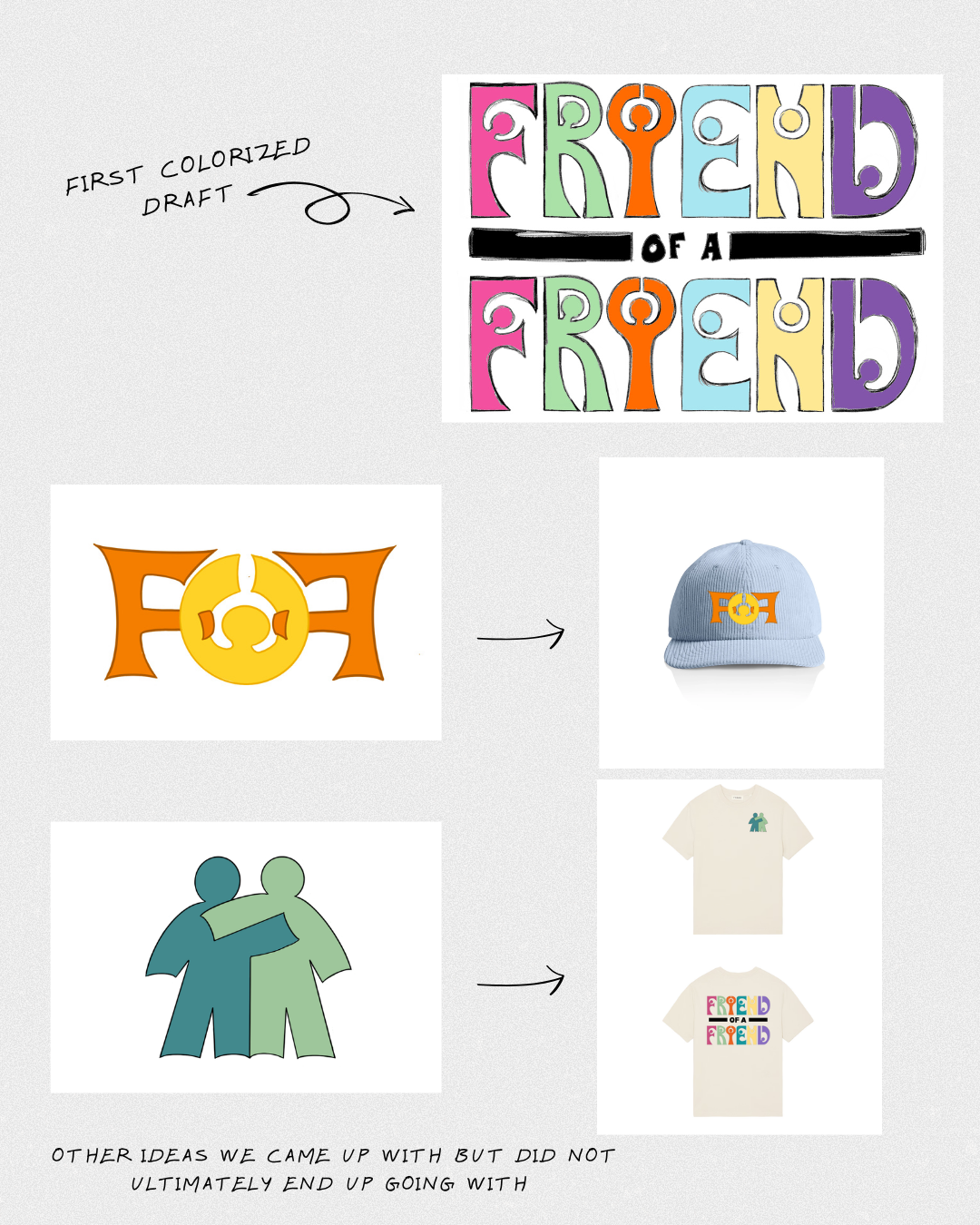 This part of the project focused on shaping the visual identity of Friend of a Friend through logo exploration, typography, color, and promotional graphics. The goal was to create visuals that felt bold, recognizable, and flexible across different formats.